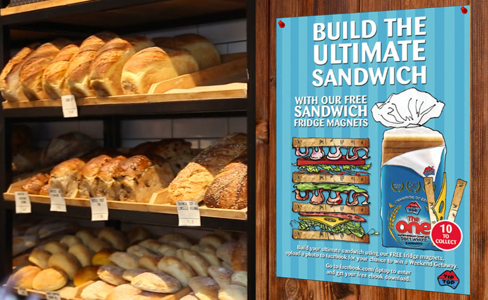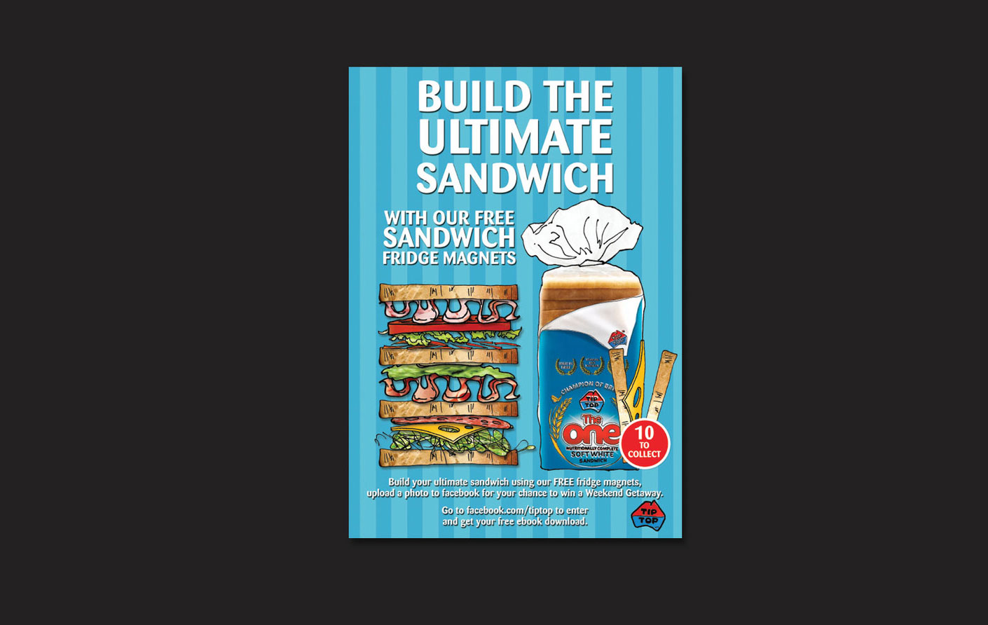 Brief: Tip Top wanted to get people excited about making sandwiches and drive them to their Facebook page. Each loaf gave away ingredients as a fridge magnet, once they built their custom sandwich, the buyer was encouraged to upload a photo to the Tip Top Facebook page. Visitors voted and the best won a prize.